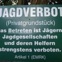 Seit 1.4.2016 sind 6 Hektar zusammenhängende Wald- und Wiesengrundstücke im Kreis Mettmann offiziell jagdfrei. Der Eigentümer, ein engagierter Tier- und Naturschützer, hat auf seinem Grundstück Biotope angelegt. "Wir sind sehr froh, dass nun die Füchse und Wasservögel sowie ein bis zwei übrig gebliebene Hasen bei uns sicher sind. Rehe gibt es leider seit etwa zwei Jahren keine mehr, wir fürchten, dass sie alle den Jägern zum Opfer gefallen sind."